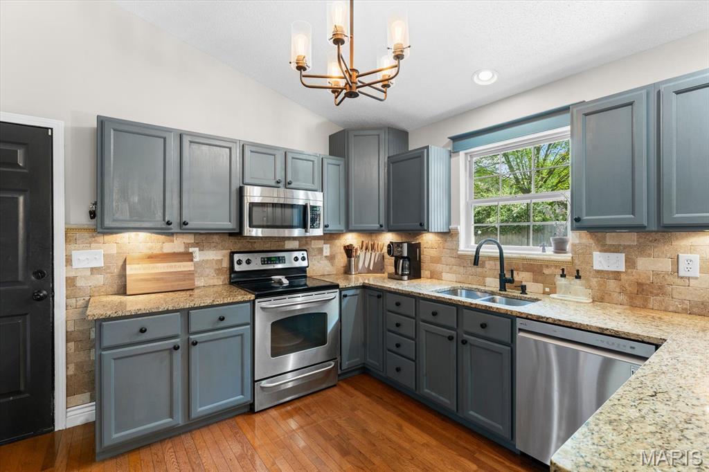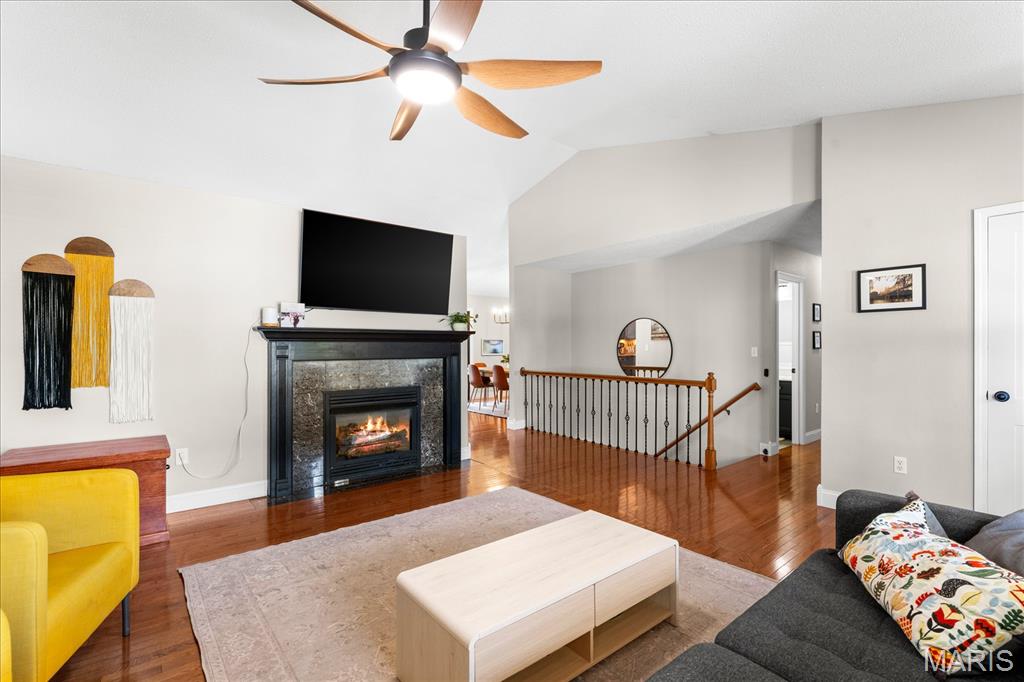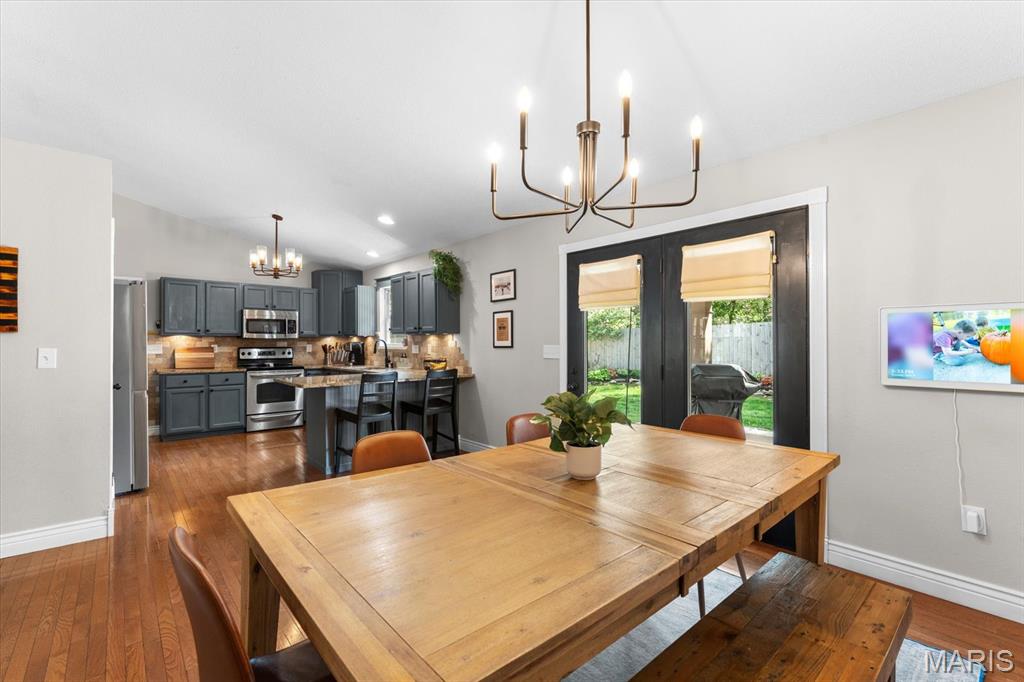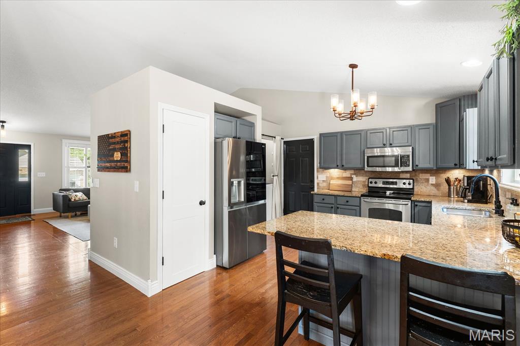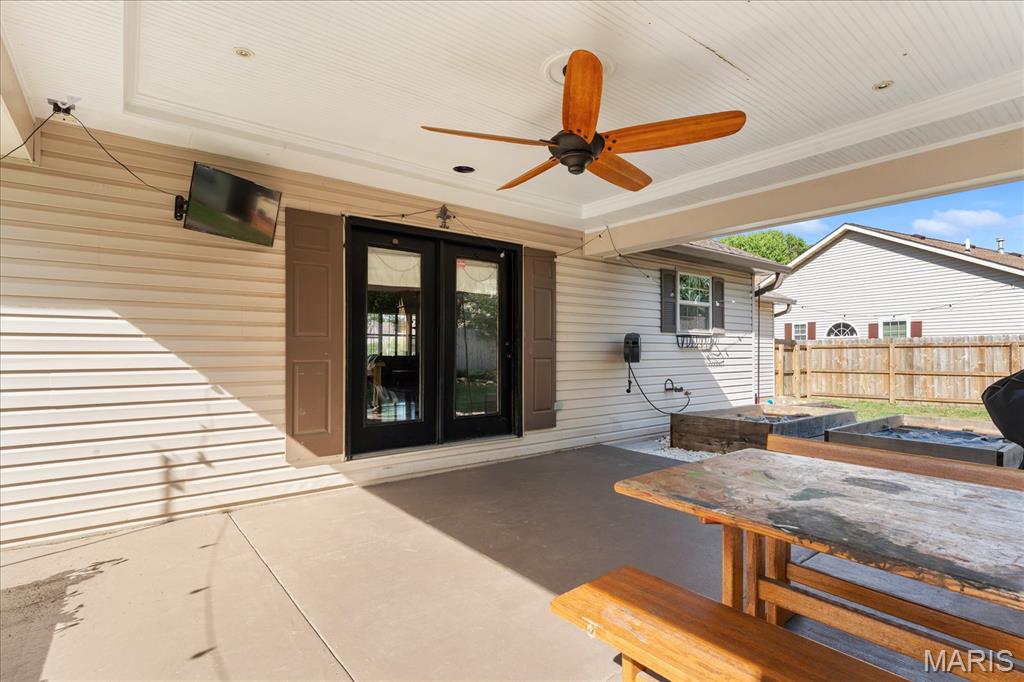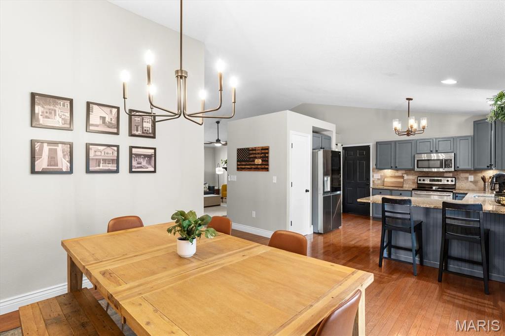 Move-in ready and loaded with upgrades, this beautifully maintained ranch offers the space, layout, and features today’s buyers are looking for! Step inside to an open floor plan with vaulted ceilings, wood floors, fresh paint throughout, and updated fixtures that give the home a clean, modern feel. The kitchen features granite countertops, stylish backsplash, stainless steel appliances, and flows seamlessly into the main living and dining areas—perfect for everyday living and entertaining. The main level includes 3 bedrooms and 2 full baths, including a spacious primary suite with ensuite bath and double sinks. Downstairs, the finished basement adds incredible versatility with a large rec room, office, bonus room, half bath, and plenty of storage space. Enjoy outdoor living in the fully fenced backyard with gorgeous landscaping and a covered patio complete with TV. Additional highlights include a 2-car garage, new A/C and water heater-2024. Conveniently located near Scott Air Force Base, shopping, and restaurants, this home checks all the boxes.