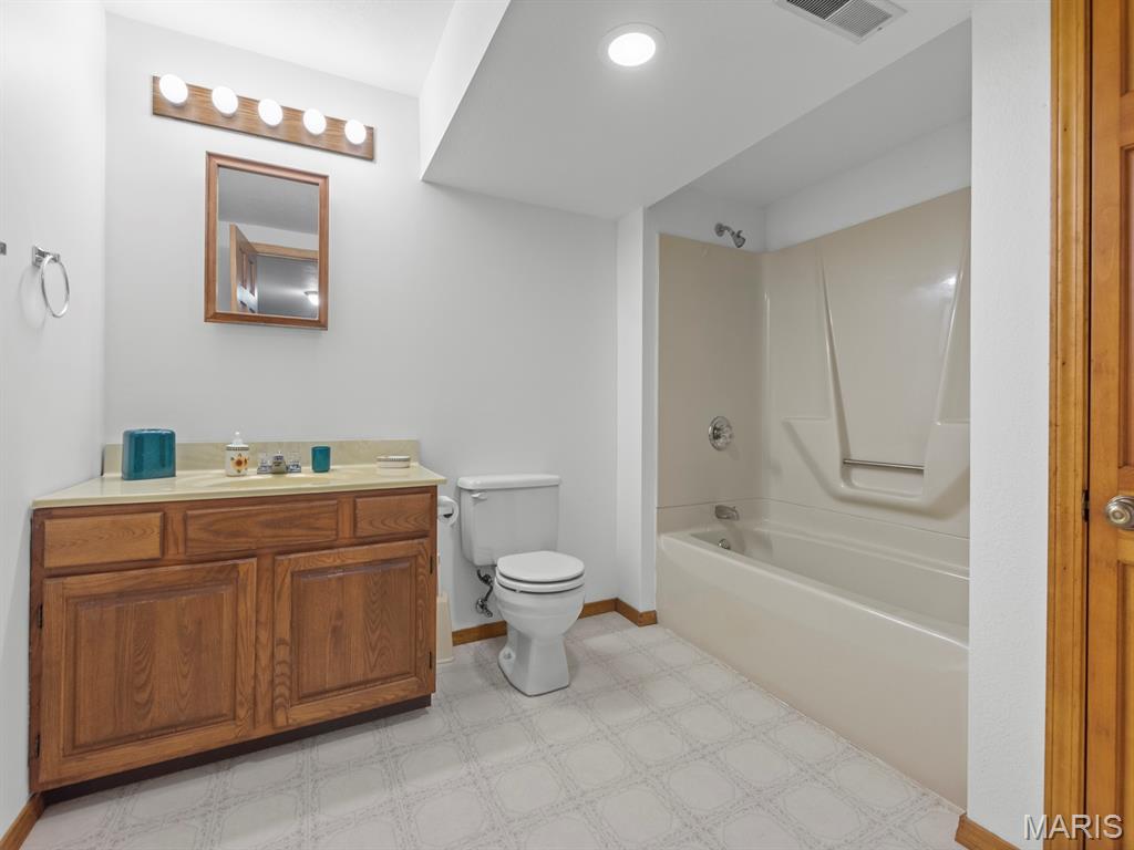 Solid as a rock! This well-designed and maintained home is only minutes to the JB Bridge and South St Louis County. Enjoy small-town living just a few blocks from Dupo Community Park. This 1.5 story home features a large living room with soaring vaulted ceilings and a floor to ceiling brick fireplace, and access door to the fairly new large deck and fenced-in yard. Kitchen is well built with plenty of cabinetry, countertop space, and work desk, plus a breakfast nook with bay window to enjoy your morning coffee, both with new flooring. Great flex space with an additional formal dining room. Main level laundry area and guest half bath with additional service door to large 380 square foot deck. Main level primary bedroom suite boasts spacious bathroom with new flooring, double vanities, and a walk-in closet. Upper level features 3 privately designed guest bedrooms and full bathroom. One bedroom is unique with its large size plus an extra bonus sitting area, or finish for even more closet space. Bonus walk-in hallway closet too. Basement is partially finished with a family room and large full bathroom too, plus some flex space to make it your own. Other features: Unfinished storage space, 2-car attached garage, zoned heating/cooling, wood 6-panel doors, and more. Recent updates include: 2023 water heater, deck/fence, new flooring in primary bathroom, kitchen and breakfast nook. Code requirements met and ready to move in so you can add your own final touches and make this house a home.