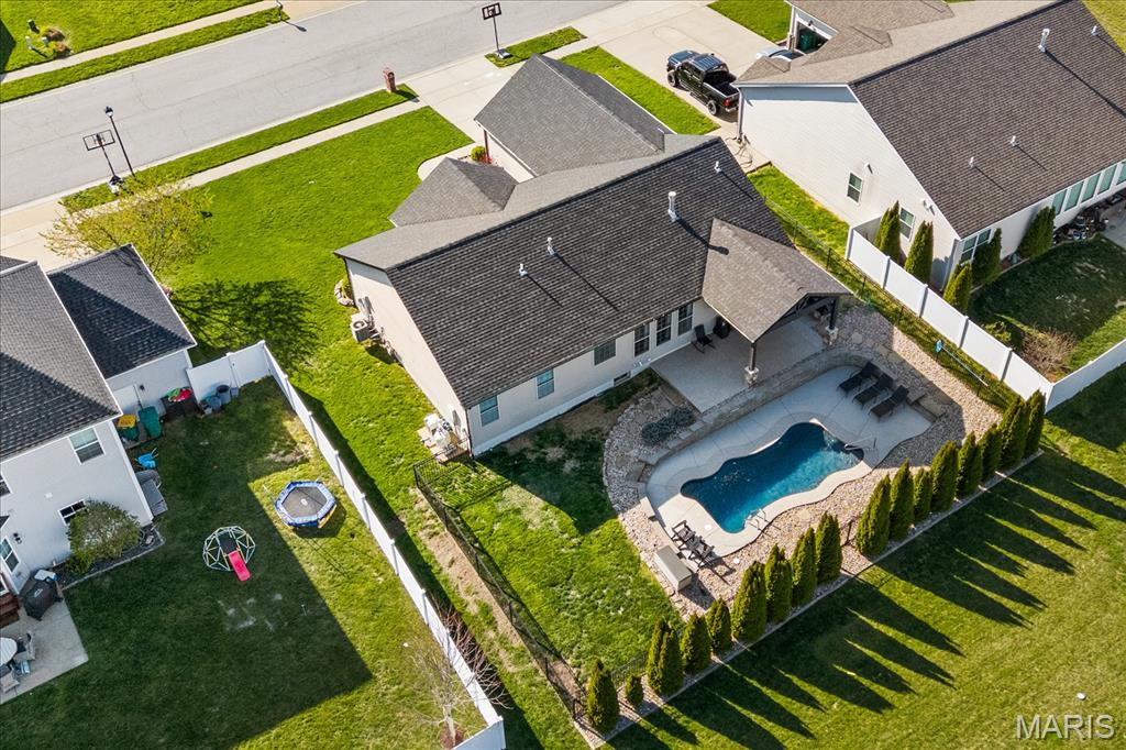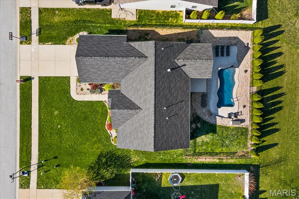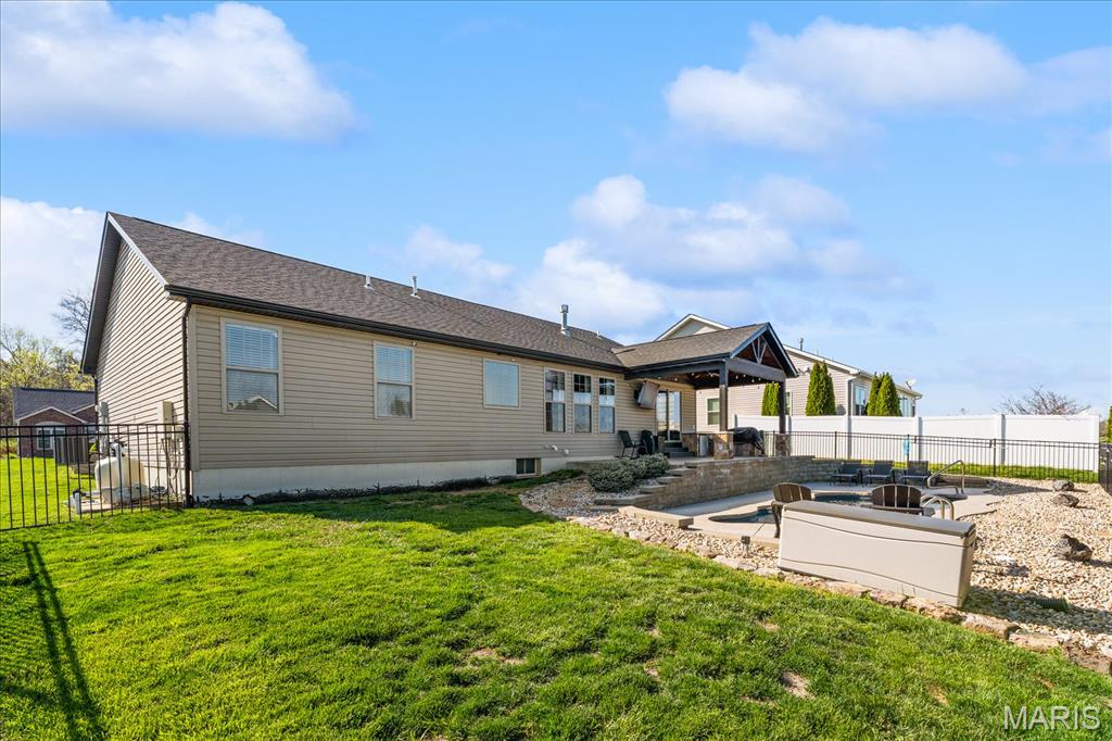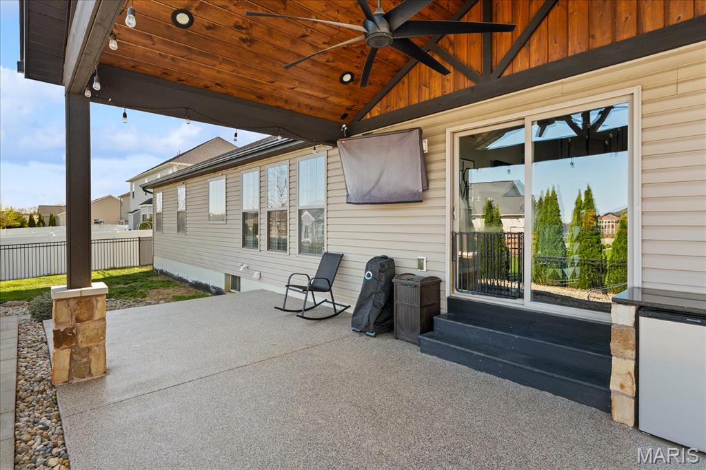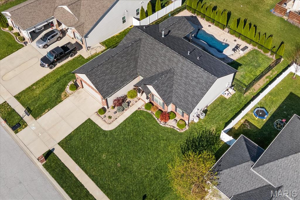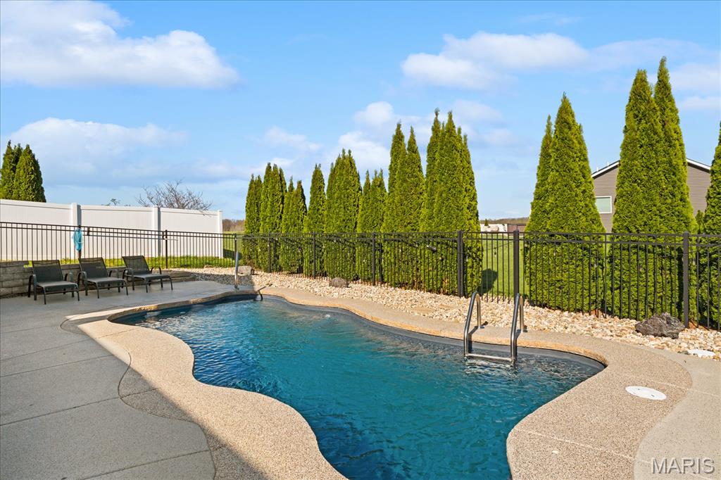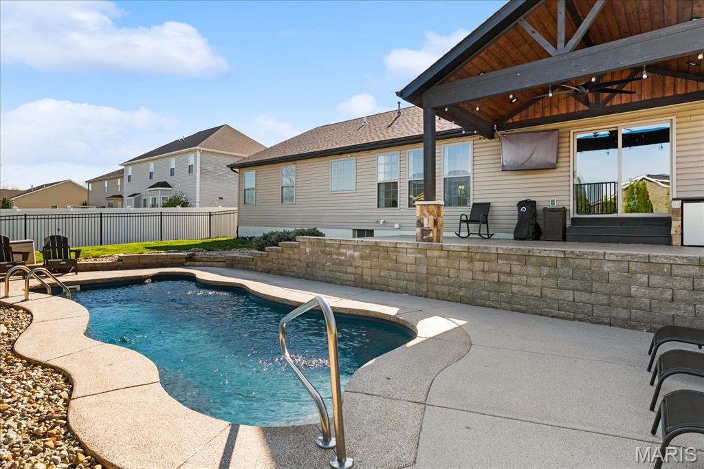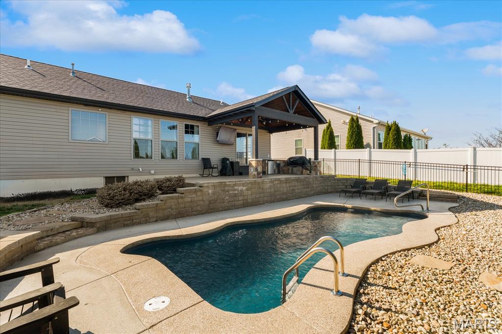 Nestled in the heart of O’Fallon in the sought-after Windsor Estates subdivision, this exceptional, meticulously maintained one-owner home offers the perfect blend of luxury, comfort, and functionality. Step inside this custom Kappert Construction build to find planked ceramic tile flooring flowing throughout the main living areas, complemented by soaring vaulted ceilings and a stunning stacked-stone, two-way gas fireplace that seamlessly connects the living room and kitchen. The fully remodeled eat-in kitchen is a true showstopper, featuring granite countertops, a custom vertical hexagon tile backsplash, spacious pantry, and sleek stainless steel appliances. The primary suite serves as a peaceful retreat with vaulted ceilings and a luxurious, fully updated en-suite bath complete with new vanity, honeycomb tile flooring, and custom oversized tiled shower w/dual shower heads. The main level also includes a versatile formal dining room that can double as a home office, convenient main-floor laundry, two additional guest bedrooms, and a full bath. The finished lower level boasts a 9-foot pour and is designed to impress, offering a custom wet bar, spacious secondary living area with a raised floor for theater-style seating, a fourth bedroom, and a full bath—ideal for guests or extended living. Additional non-conforming space provides endless possibilities for a home gym, hobby area, or storage. Outside you'll find the best part of this exceptional property: your private backyard oasis featuring custom landscaping, an in-ground heated saltwater pool, an oversized, covered, concrete patio, and a built-in outdoor kitchen—perfect for entertaining year-round. Recent updates include (but are not limited to) a new water heater (2024) and architectural shingle roof and gutters (2025), providing added peace of mind. This home truly has it all—style, space, and exceptional upgrades throughout