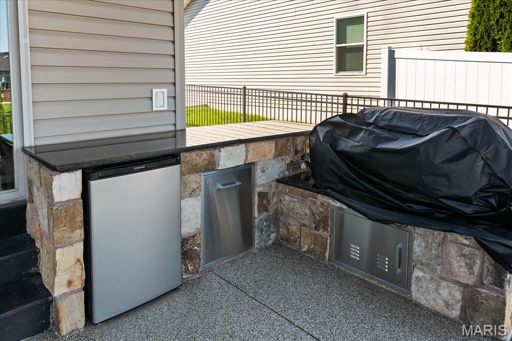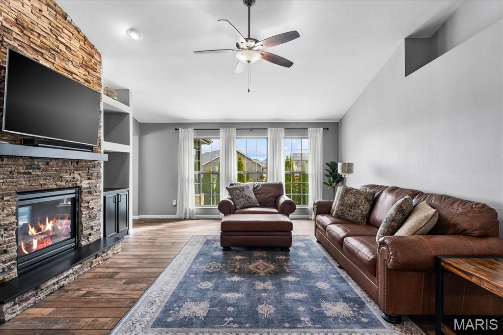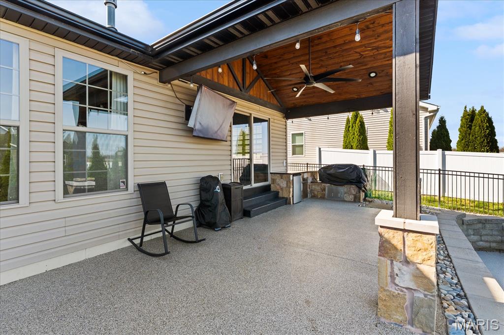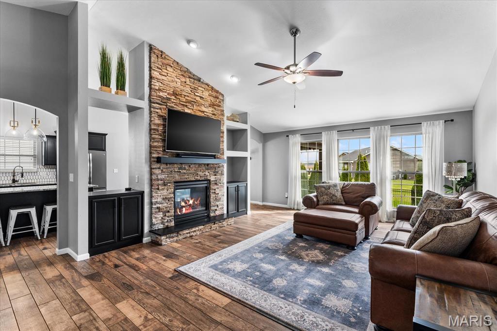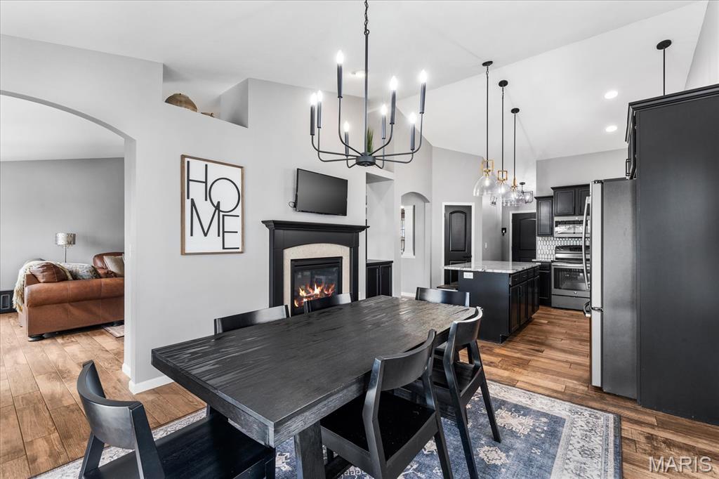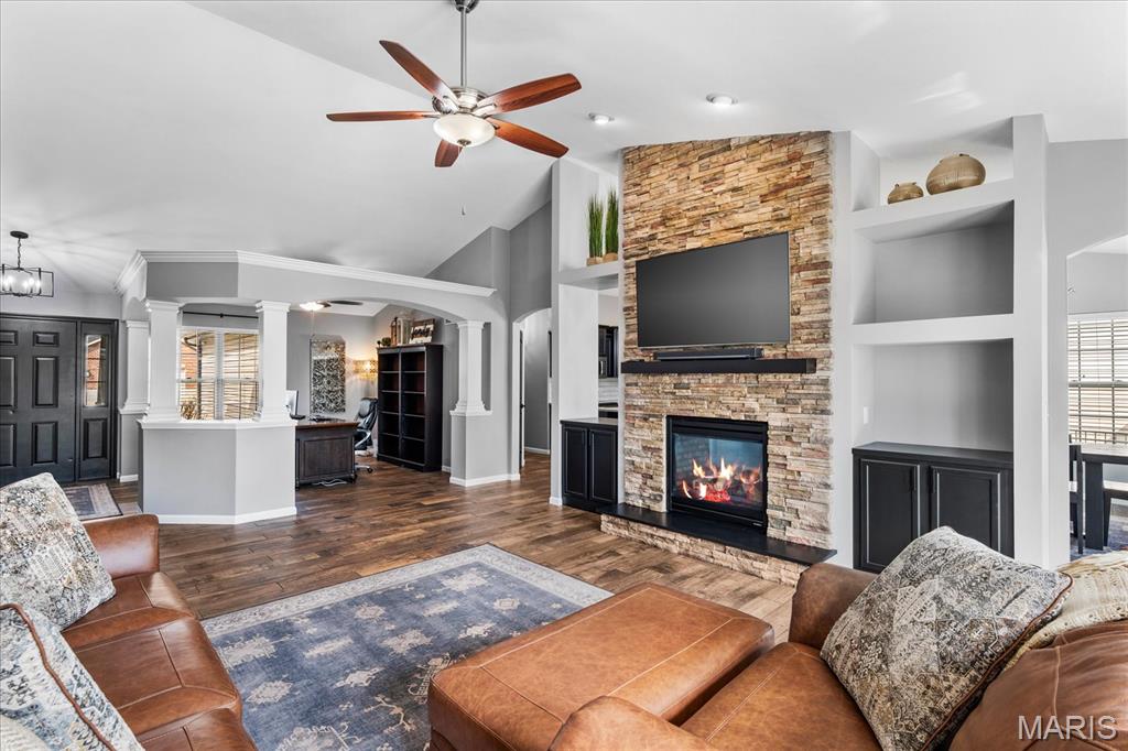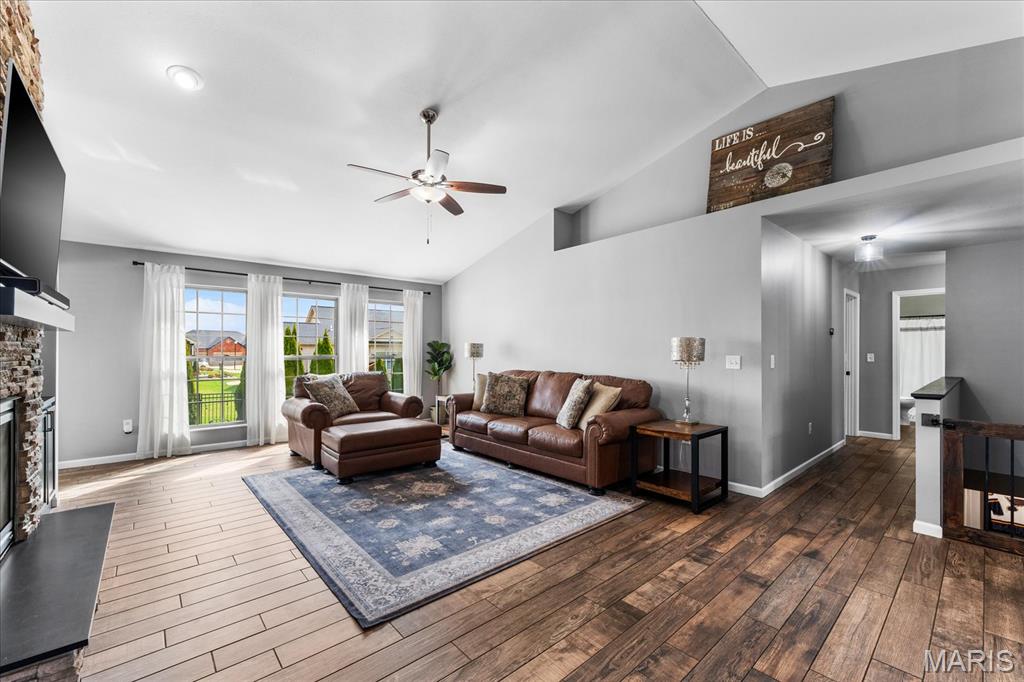Nestled in the heart of O’Fallon in the sought-after Windsor Estates subdivision, this exceptional, meticulously maintained one-owner home offers the perfect blend of luxury, comfort, and functionality. Step inside this custom Kappert Construction build to find planked ceramic tile flooring flowing throughout the main living areas, complemented by soaring vaulted ceilings and a stunning stacked-stone, two-way gas fireplace that seamlessly connects the living room and kitchen. The fully remodeled eat-in kitchen is a true showstopper, featuring granite countertops, a custom vertical hexagon tile backsplash, spacious pantry, and sleek stainless steel appliances. The primary suite serves as a peaceful retreat with vaulted ceilings and a luxurious, fully updated en-suite bath complete with new vanity, honeycomb tile flooring, and custom oversized tiled shower w/dual shower heads. The main level also includes a versatile formal dining room that can double as a home office, convenient main-floor laundry, two additional guest bedrooms, and a full bath. The finished lower level boasts a 9-foot pour and is designed to impress, offering a custom wet bar, spacious secondary living area with a raised floor for theater-style seating, a fourth bedroom, and a full bath—ideal for guests or extended living. Additional non-conforming space provides endless possibilities for a home gym, hobby area, or storage. Outside you'll find the best part of this exceptional property: your private backyard oasis featuring custom landscaping, an in-ground heated saltwater pool, an oversized, covered, concrete patio, and a built-in outdoor kitchen—perfect for entertaining year-round. Recent updates include (but are not limited to) a new water heater (2024) and architectural shingle roof and gutters (2025), providing added peace of mind. This home truly has it all—style, space, and exceptional upgrades throughout